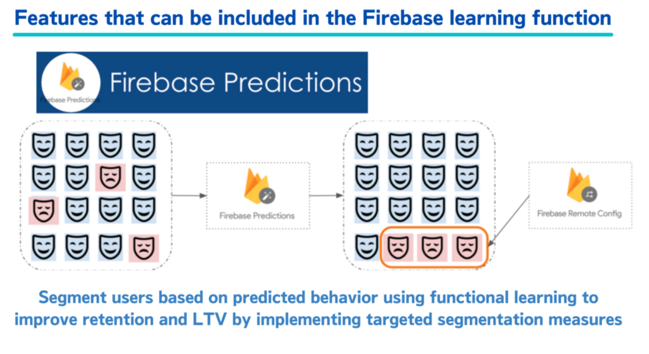 Firebase นำแมชชีนเลิร์นนิงไปใช้ในแอป เปิดใช้งานการแบ่งกลุ่มอัจฉริยะ ซึ่งเป็นการจัดประเภทอัตโนมัติที่ระบุผู้ใช้ที่ไม่น่าจะทำการซื้อในแอป และแสดงโฆษณาต่อผู้ที่ไม่ได้ซื้อเหล่านี้เท่านั้น