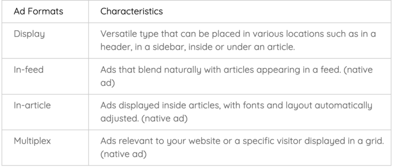 Google AdSense displays four main ad formats: